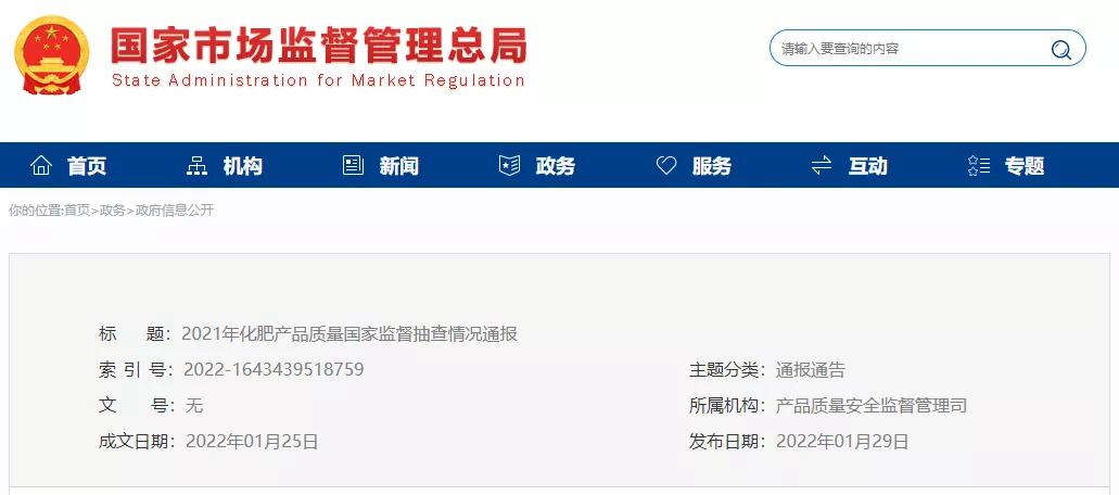 据市场监管总局网站消息,2021年,市场监管总局组织开展了化肥产品质量国家监督抽查。现将抽查情况通报如下: